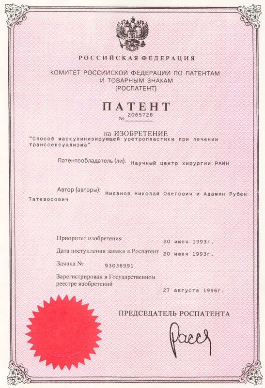 | Патент №: 2065728 Изобретение: Способ маскулизирующей уретропластики при лечении транссекуализма. Патентообладатель: Научный центр хирургии РАМН. Авторы: Миланов Николай Олегович и Адамян Рубен Татевосович. Приоритет изобретения: 20.07.1993 |